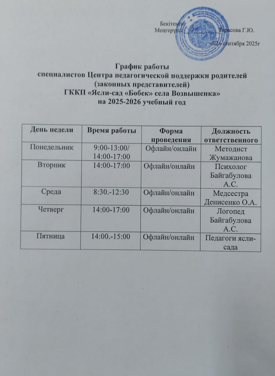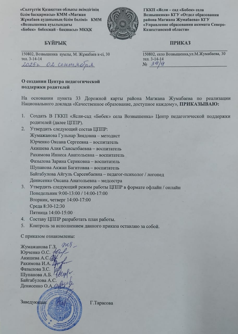 Бұйырамын ата-аналардың қолдауы педагогикалық орталығын құру туралы / Приказ о создании Центра педагогической поддержки родителей