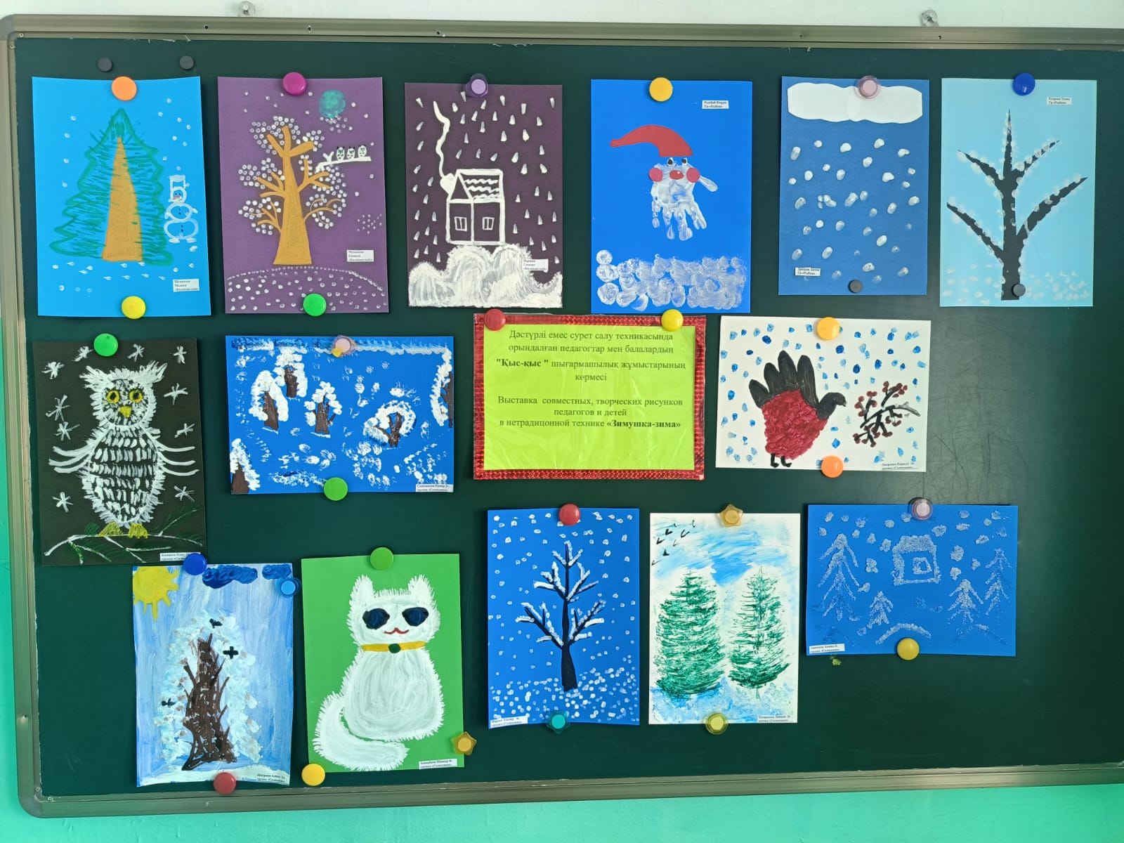 Дәстүрлі емес сурет салу техникасында орындалған педагогтар мен балалардың "Қыс-қыс" шығармашылық жұмыстарының көрмесі / Выставка совместных, творческих рисунков педагогов и детей в нетрадиционной технике "Зимушка-зима"