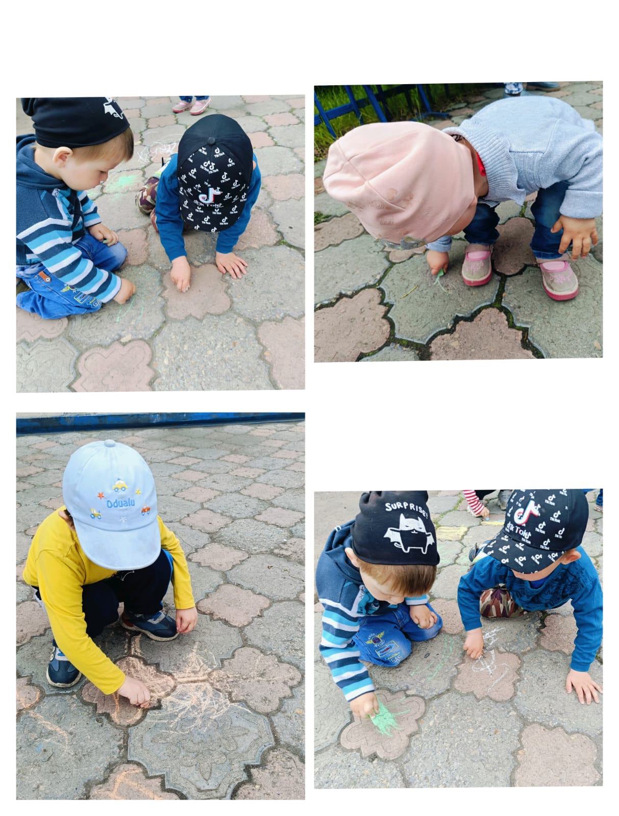 Бормен сурет салу. Мақсаты: асфальтта өз бетінше сурет салу қабілетін дамыту, ұжымда жұмыс істеуге үйрету. "Балықтар" тобы Рисование мелками. Цель: развитие умения рисовать на асфальте самостоятельно, учить работать в коллективе. Группа "Рыбки"