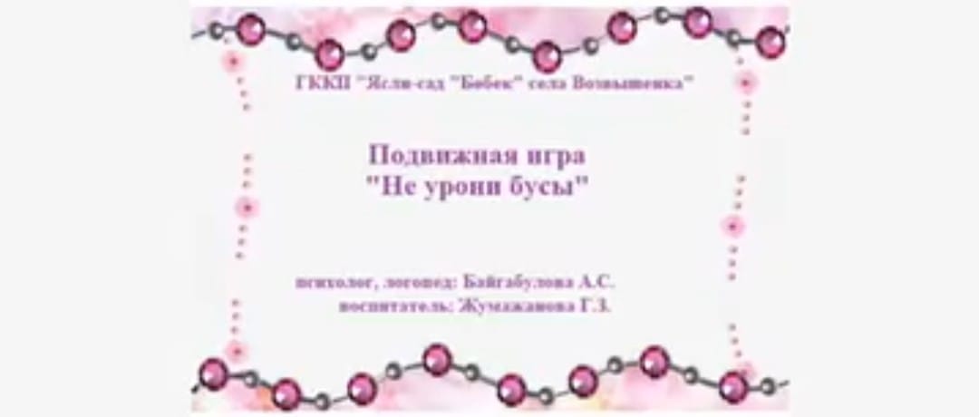"Моншақтарды тастамаңыз" қимыл-қозғалыс ойыны Мақсаты: баста моншақтармен жүру кезінде жалпы моториканы және дұрыс позаны қалыптастыру Подвижная игра " Не урони бусы" Цель: Формирование крупной моторики и правильной осанки при ходьбе с бусами на голове психолог, логопед: Байгабулова А.С. воспитатель: Жумажанова Г.З.