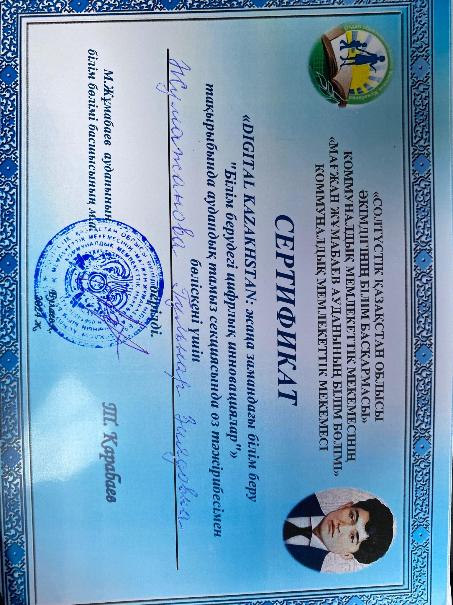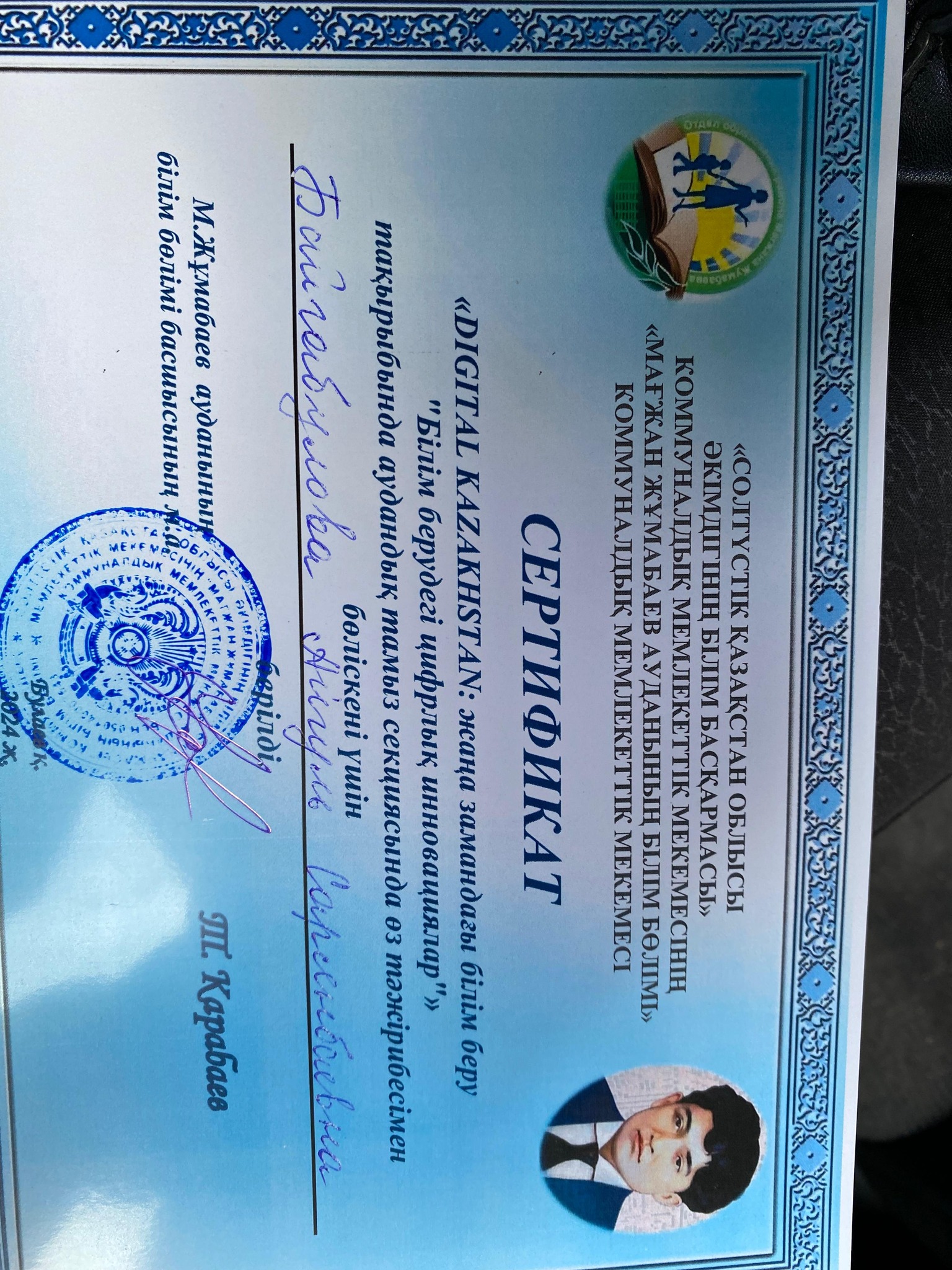 Аудандық тамыз секциясында "Digital Kazakhstan: жаңа замандағы білім беру "Білім берудегі цифрлық инновациялар " тақырыбына қатысты Приняли участие в "Digital Kazakhstan:Образование нового времени "цифровые инновации в образовании" в районной августовской секции психолог, логопед :Байгабулова А.С.; воспитатель : Жумажанова Г.З.