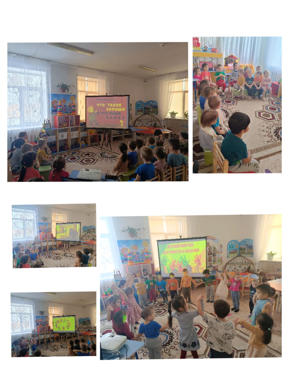 Бұзақылықтың алдын алу мақсатында тәрбиешілер «Зорлық-зомбылықсыз, зорлық-зомбылықсыз балалық шақ» атты іс-шара өткізді. Міндеті: «зорлық», «қатыгездік» ұғымдарының мағынасын ашу, құрбылары арасында қатыгездік пен зорлық-зомбылық көріністеріне теріс көзқарасты тәрбиелеу, түсіну қабілетін дамыту және басқа адамды кешіре білу, адамгершілік қасиеттер мен құндылықтарды тәрбиелеу. В целях профилактики буллинга педагогами было проведено мероприятие:«Детство без жестокости и насилия » Задача : раскрыть значение понятий «насилие» , «жестокость»,воспитывать отрицательное отношение к проявлениям жестокости и насилия среди сверстников, развивать способность понимать и умение прощать другого человека, воспитывать нравственные качества и ценности.