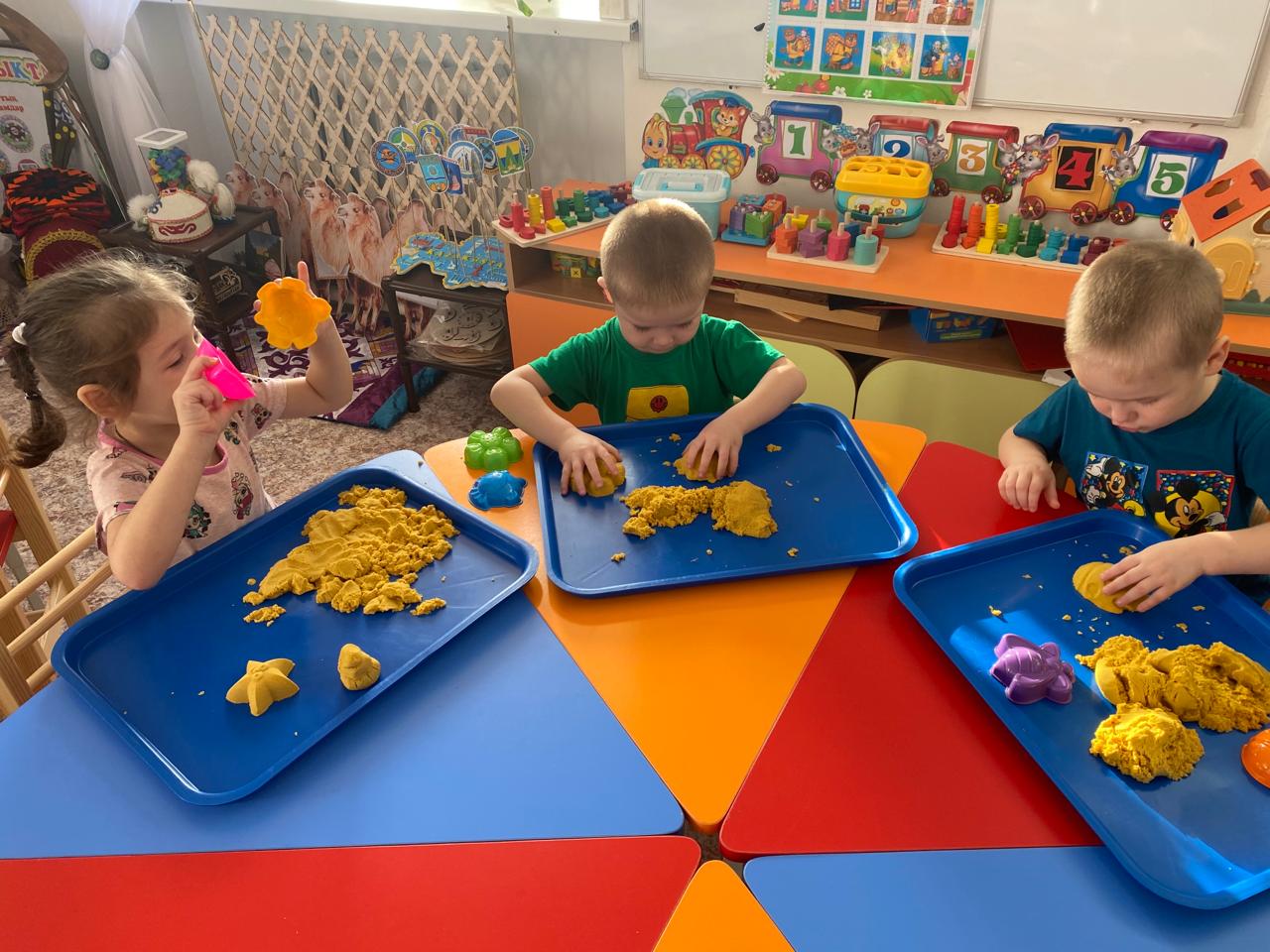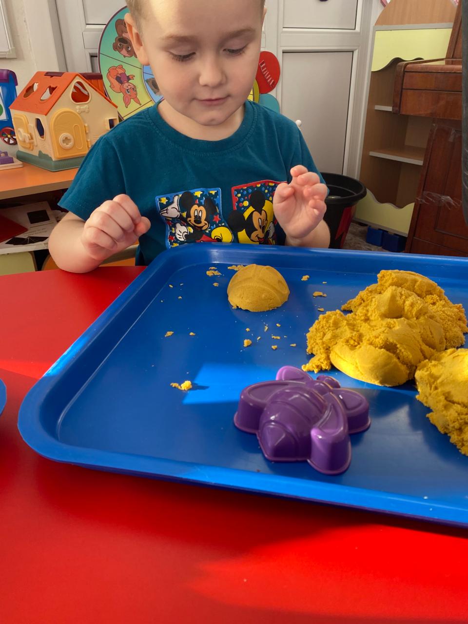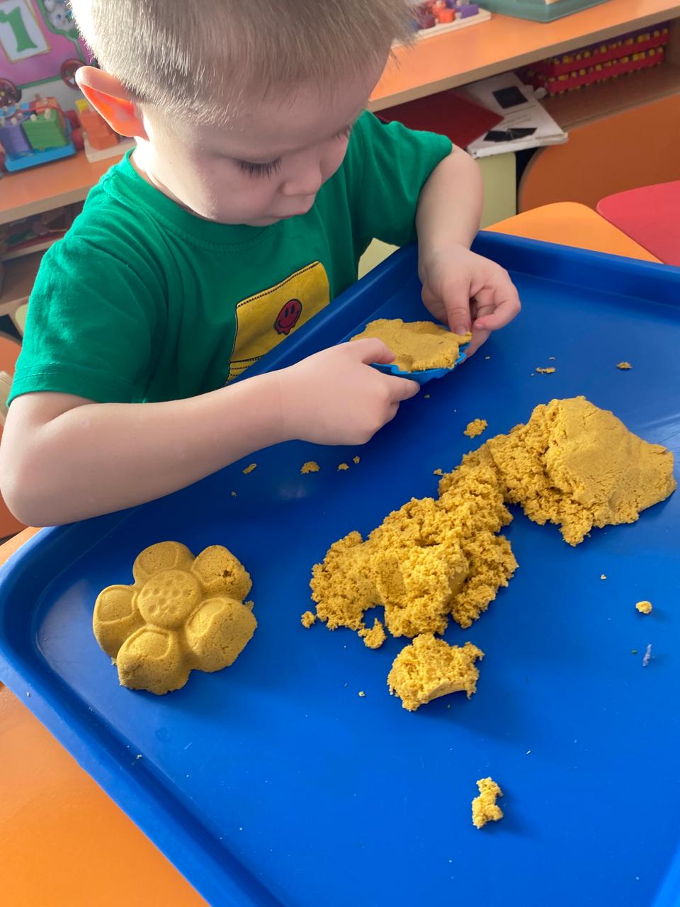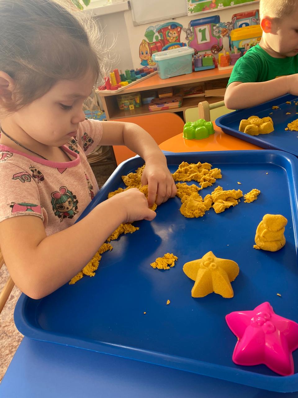 Кинетикалық құммен мүсіндеу бойынша ұйымдастырылған іс-әрекет Организованная деятельность по лепке кинетическим песком группа "Солнышко"