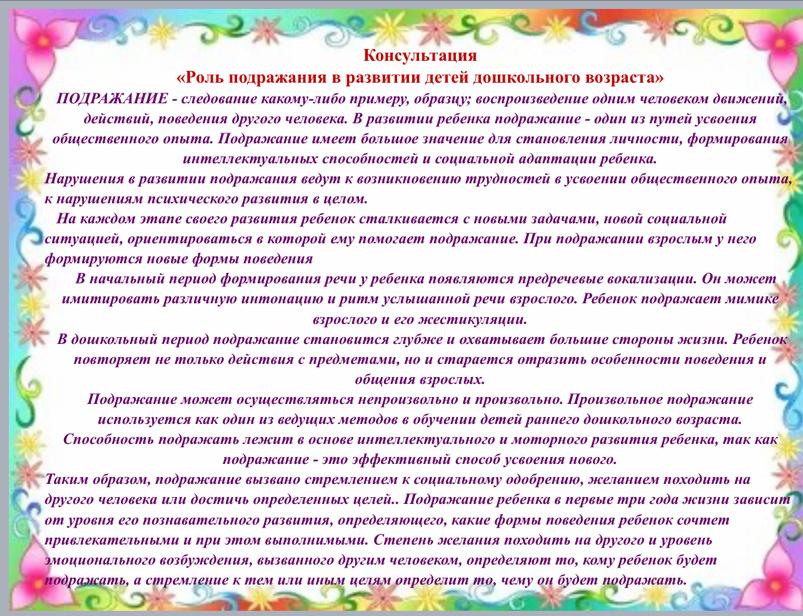 Ата-аналарға кеңес беру "Мектеп жасына дейінгі балалардың дамуындағы еліктеудің рөлі" консультациялық пункттің жұмыс жоспарына сәйкес Возвышенка ауылының "Бөбек" бөбек-бақшасы " МКҚК 2023-2024 оқу жылына Согласно плана работы консультационного пункта ГККП «Ясли-сад «Бөбек» села Возвышенка» на 2023-2024 учебный год консультация для родителей "Роль подражания в развитии детей дошкольного возраста"