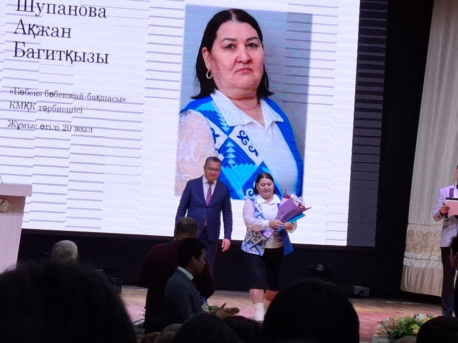 Мағжан Жұмабаев ауданының әкімінің құрмет грамотасымен Білім беру жүйесіндегі көп жылдық адал еңбегі өскелең ұрпақты оқыту мен тәрбиелеуге қосқан зор үлесі үшін және Мұғалім күні мерекесін өткізуге байланысты Ақжан Багитқызы марапатталды. Почетной грамотой акима района Магжана Жумабаева награждена Акжан Багитовна за многолетний, добросовестный труд в системе образования, большой вклад в обучение и воспитание подрастающего поколения и в связи с празднованием Дня учителя.
